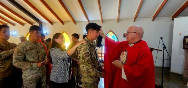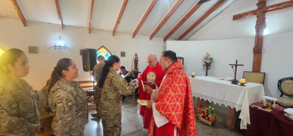 Monseñor Jaime Casals Vicario General del Obispo Castrense presidió la celebración y entregó el sacramento a los soldados, pidiéndoles que sean cómo el centurión, soldado romano que pidió a Jesús que sane a su sirviente, con un profunda Fe, coincidente con el evangelio del día. “La gracia se recibe según el recipiente”, les dijo, señalando que depende de cada uno el recibir más o menos de la Gracia de Dios.
