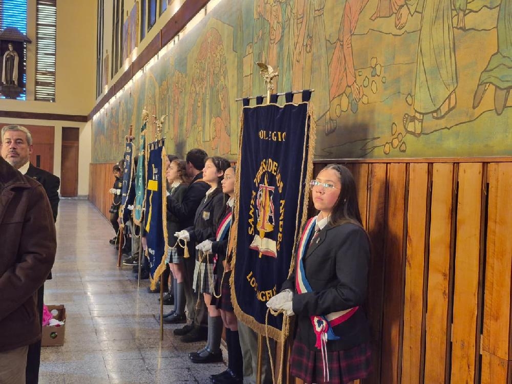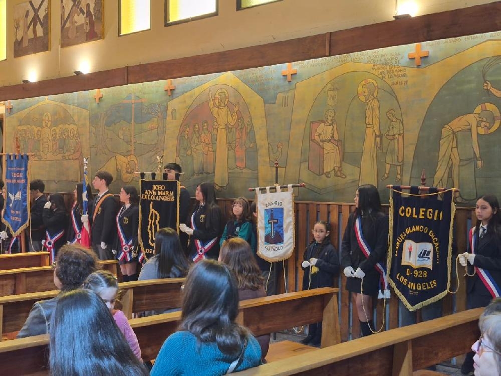 La Eucaristía fue acompañada también por numerosos fieles de la comunidad angelina, quienes manifestaron su cercanía y reconocimiento a la institución. De manera especial, se hicieron presentes los estandartes de los escuelas, colegios y liceos de la ciudad, que aportaron un signo visible de respeto, tradición y compromiso formativo.
