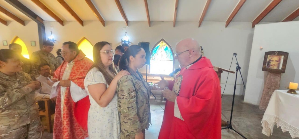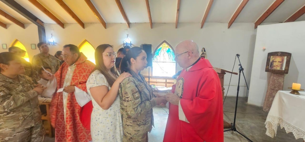 Monseñor Jaime Casals Vicario General del Obispo Castrense presidió la celebración y entregó el sacramento a los soldados, pidiéndoles que sean cómo el centurión, soldado romano que pidió a Jesús que sane a su sirviente, con un profunda Fe, coincidente con el evangelio del día. “La gracia se recibe según el recipiente”, les dijo, señalando que depende de cada uno el recibir más o menos de la Gracia de Dios.